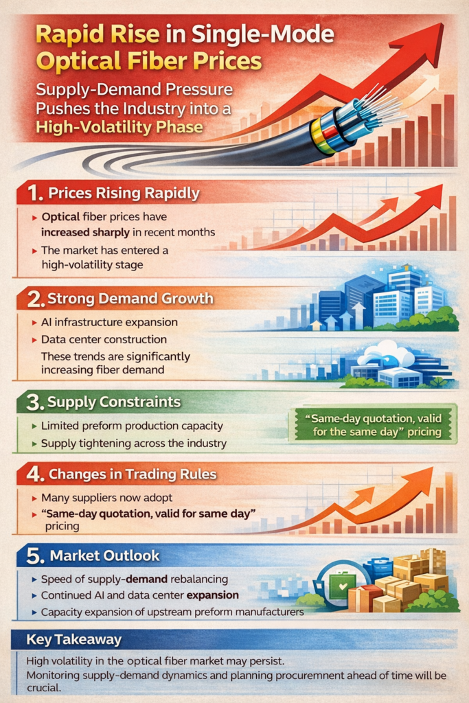 Introduction: Since the beginning of 2026, the price of single-mode fiber in the domestic market has risen significantly, with some models experiencing substantial price increases in a short period, and the market trading rhythm has also changed significantly. Recently, many industry practitioners have reported that current single-mode fiber prices are fluctuating frequently, and some suppliers have adopted a “same-day quotation, valid only on the same day” approach to cope with market changes. Behind the rapid price increase is the combined effect of multiple factors, including increased demand, upstream capacity constraints, and short-term supply-demand mismatch.